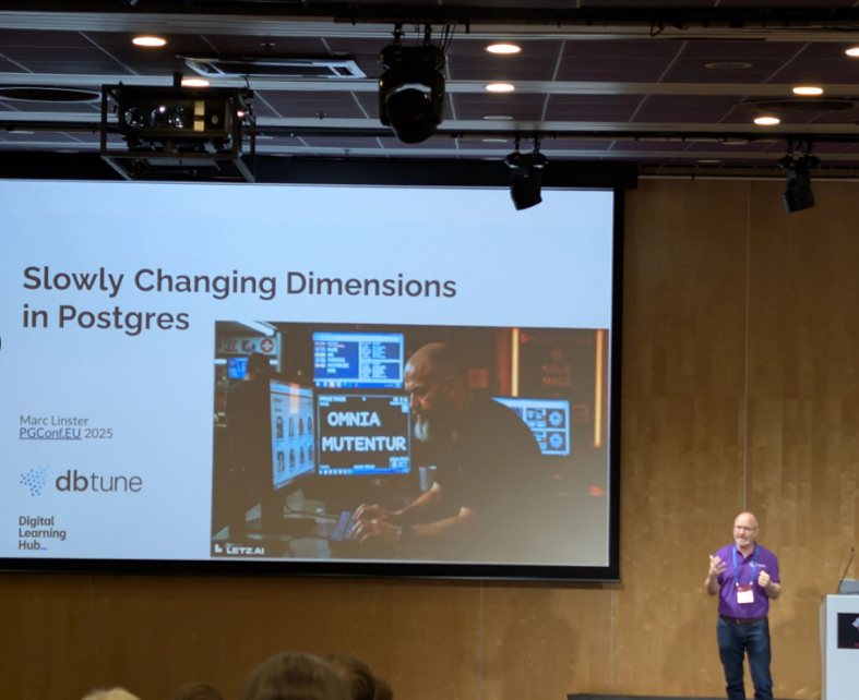 Marc Linster, our DBtune Fellow and one of the organizers of PGConf EU 2025 in Riga, Latvia, also presented a talk at PGConf.EU 2025 focused on Implementing Slowly Changing Dimensions (SCDs) in Postgres, providing a comprehensive review of the six standard types of SCDs and showcasing how PostgreSQL's advanced features can simplify their practical implementation. SCDs are crucial for data warehousing, as they define how to track changes in reference data—like pricing or employee hierarchies—over time, a challenge that, if managed manually, can lead to complex and error-prone systems.